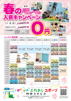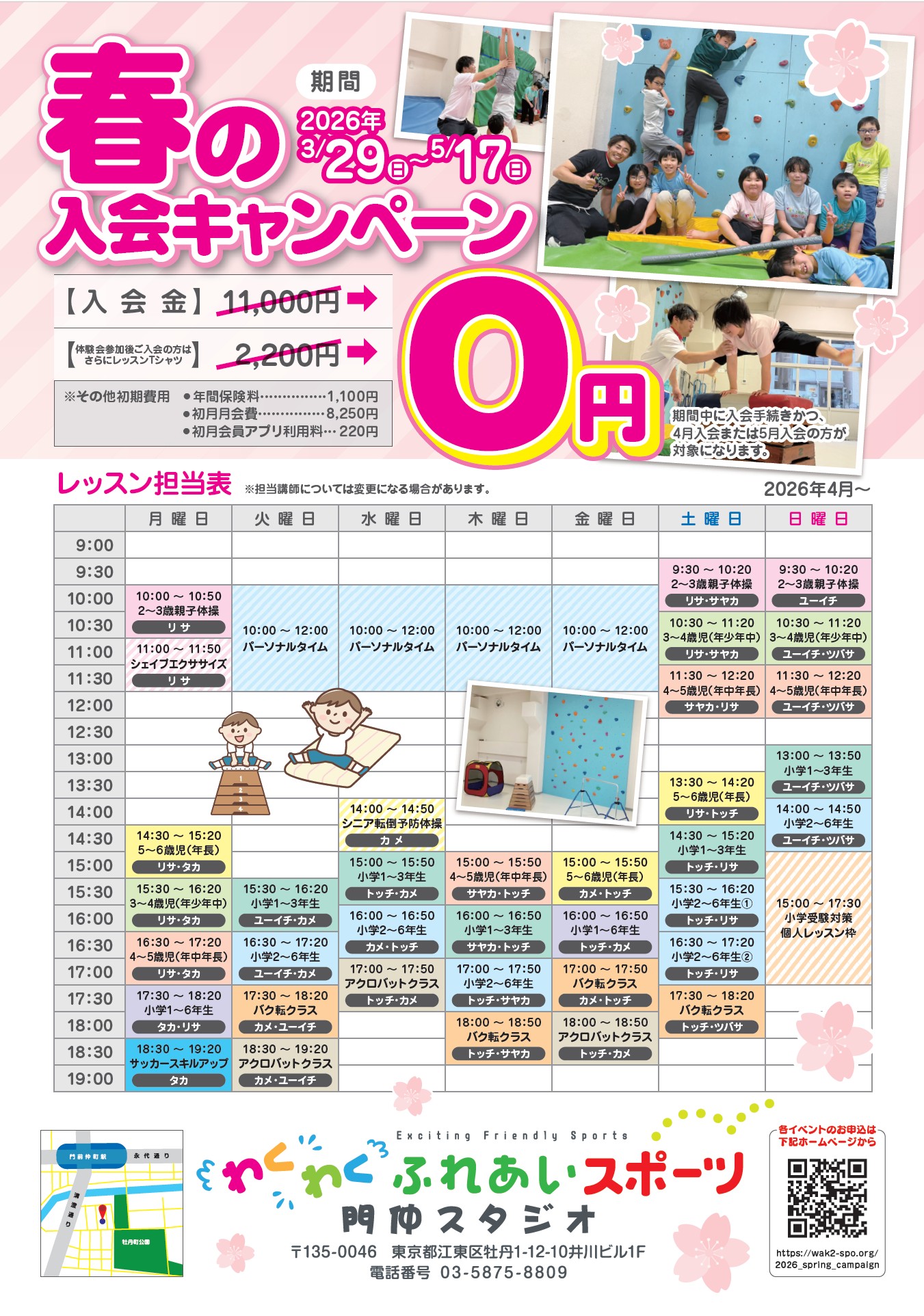 | 特典 | 入会金¥11,000→¥0 体験会参加後ご入会の方はさらに レッスンTシャツ代¥2,200→¥0 |