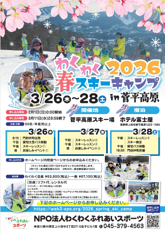 | 参加費 | わくわく会員:¥63,800-(税込) 一般:¥67,100-(税込) (宿泊費、貸切大型バス代、レッスン代、保険料、6食分食事代) 別途 リフト代、レンタル代 【リフト代】 ¥7,700円(3日券) 【レンタル代】 詳細は下記よりご確認下さい |