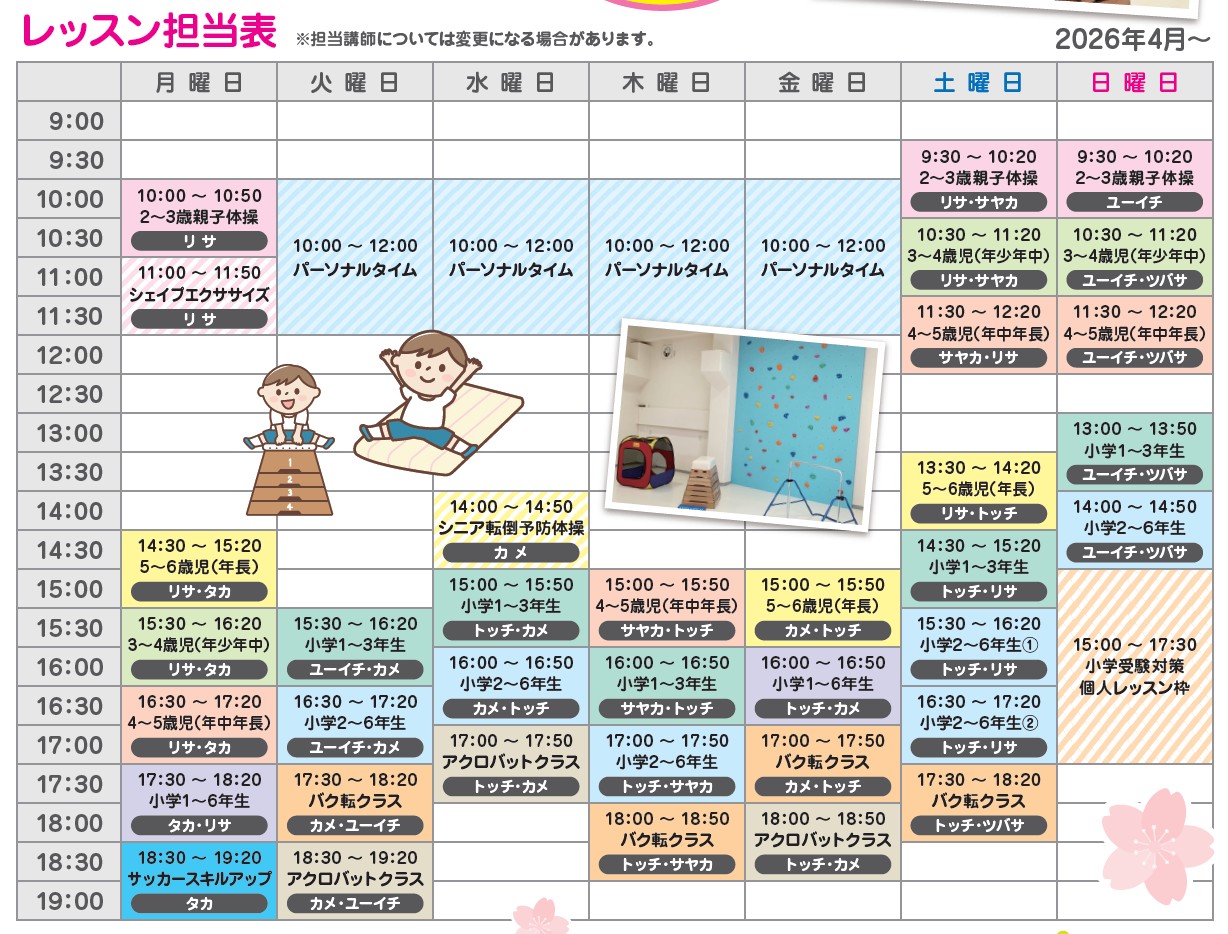 | 18:00 | 18:00~18:50 バク転クラス トッチ・サヤカ |